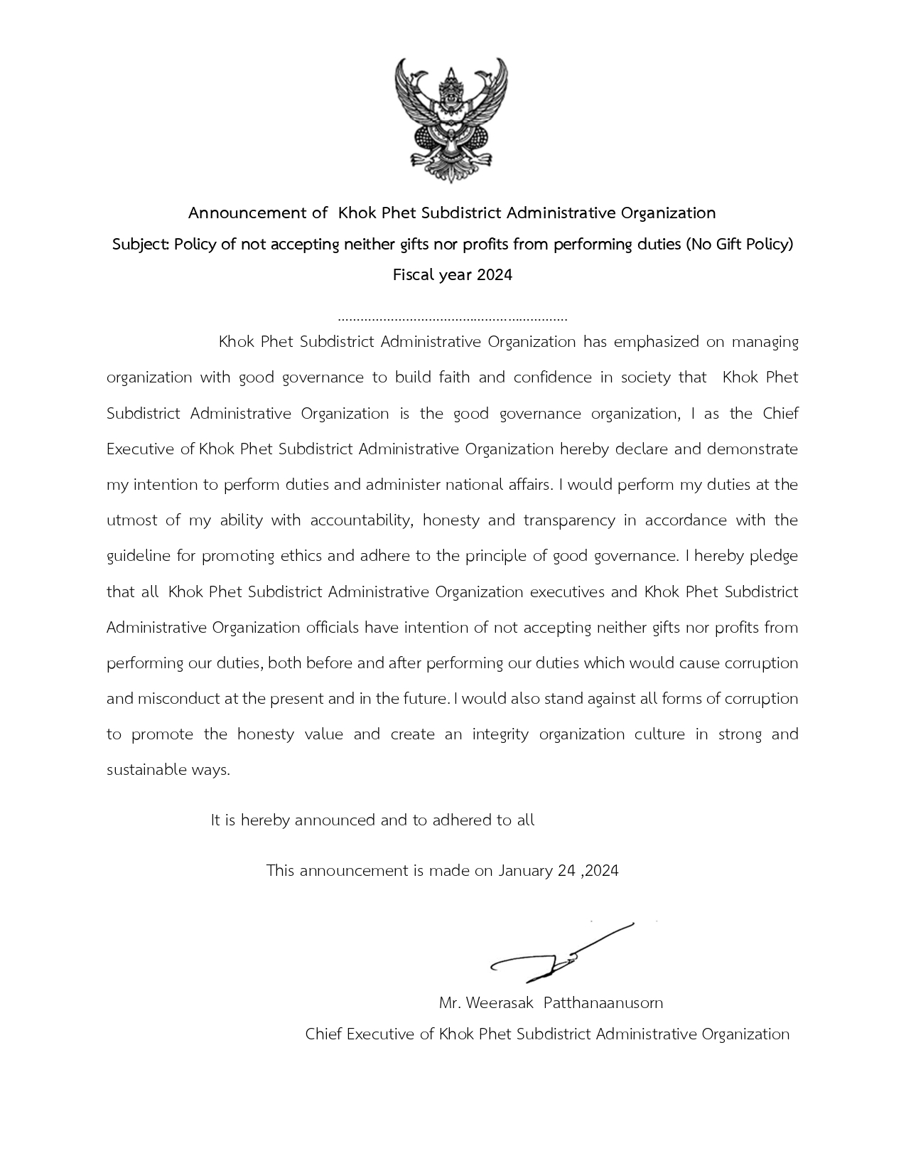 นโยบายไม่รับของขวัญหรือของกำนัลจากการปฏิบัติหน้าที่ (No Gift Policy) ประจำปีงบประมาณ 2567